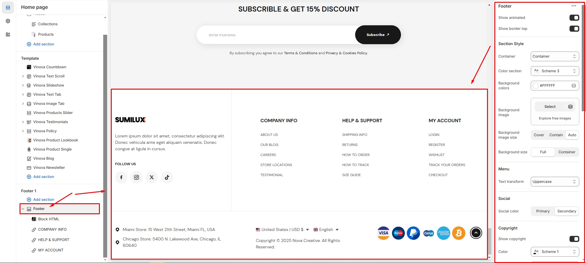 Please click on the Footer section. The customization panel of this section is on the right-hand side.