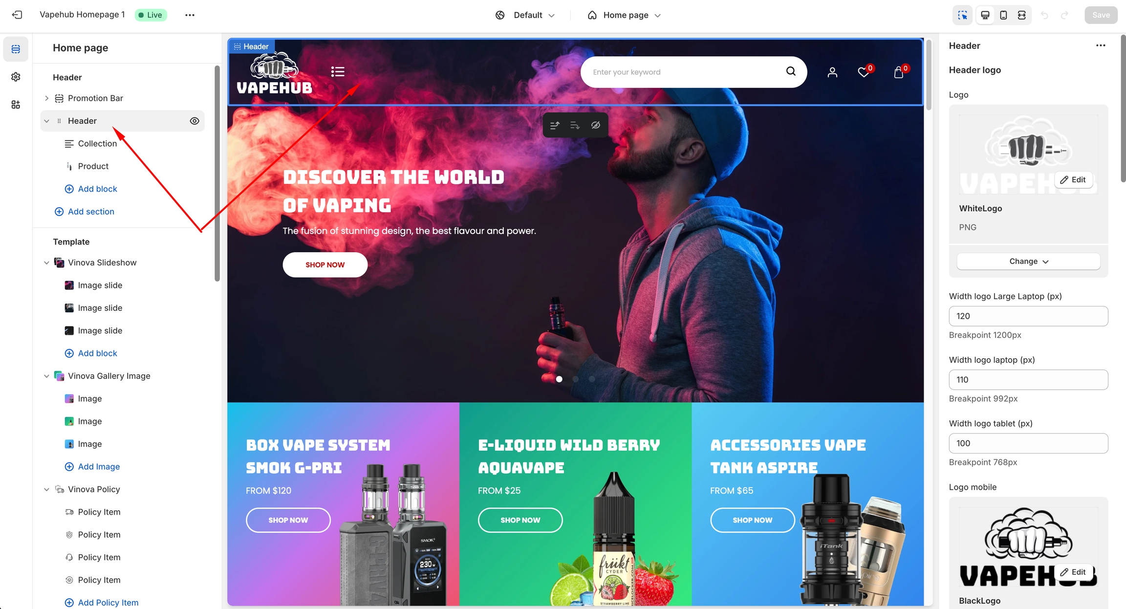 Please click on the Header section (The first section at the top). The customization panel of this section is on the right-hand side. If the Theme has a promotion bar on top, customize this section's position in the Header section.