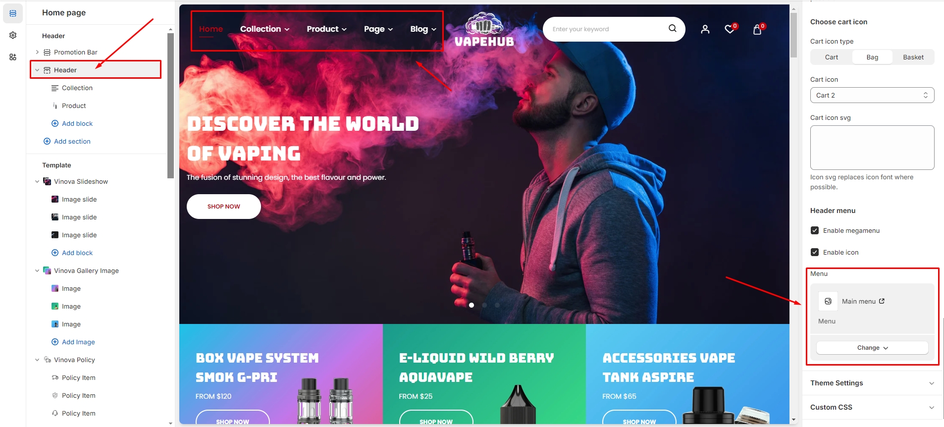 The Main menu is the menu on the Header. In this tutorial, we will show you how to set up the header menu and configure it like our demo. You can use this guide to set up your menu.