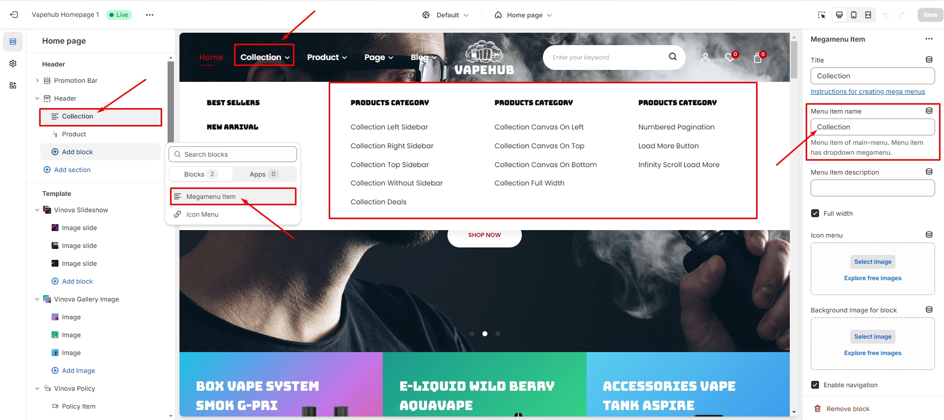 - In the Megamenu Item block, there are items: menu, image, list collection, and product. You can customize it however you want.