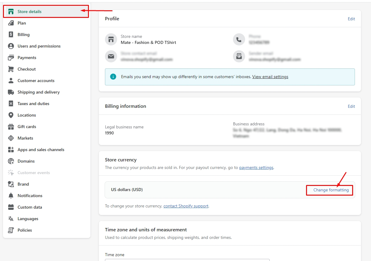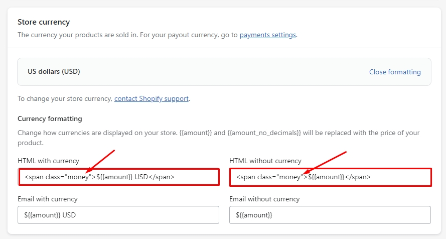 From your Shopify admin, go to Settings > Store details > Store currency > Change formatting