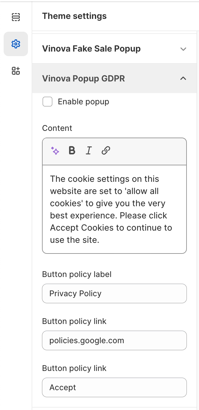 From "Theme Settings", click the tab "Vinova Popup GDPR"