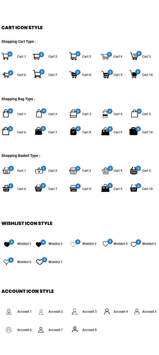 Change the Cart icon, Wishlist icon, and Account icon style with the available list. Customize icon color, background hover color, and background color. For details on these icons, please see the image below.
