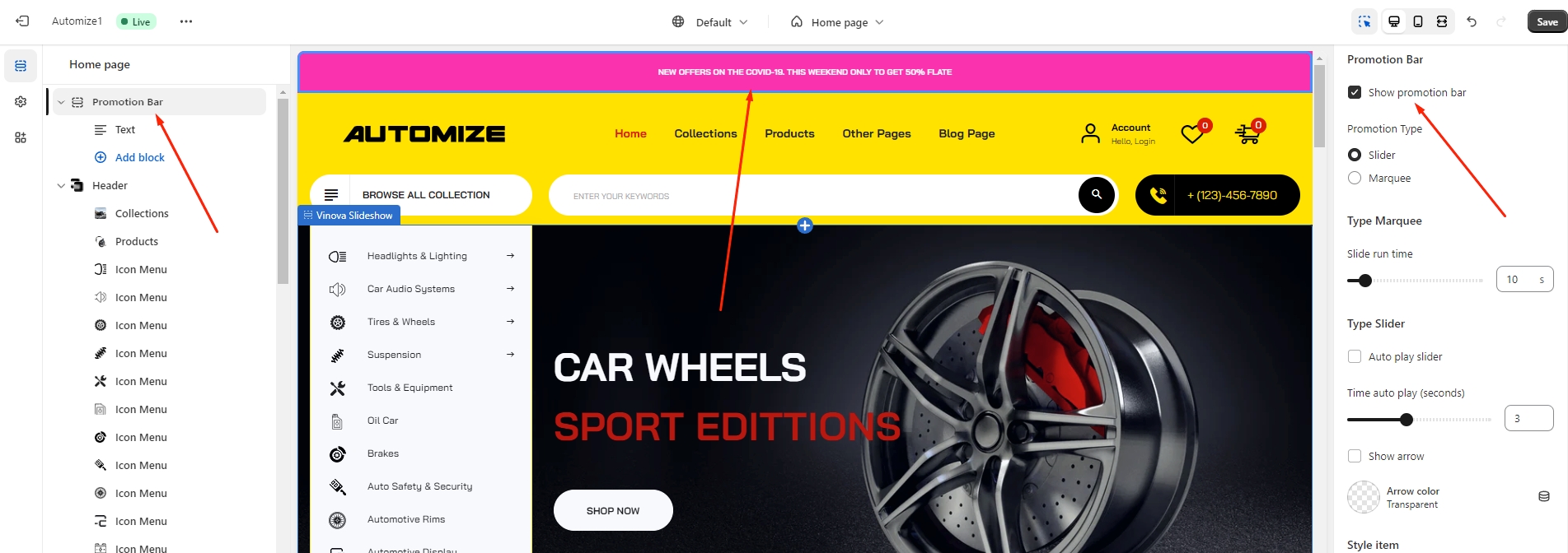 Please click on the Header section (The first section at the top). The customization panel of this section is on the right-hand side. If the Theme has a promotion bar on top, customize this section's position in the Header section.