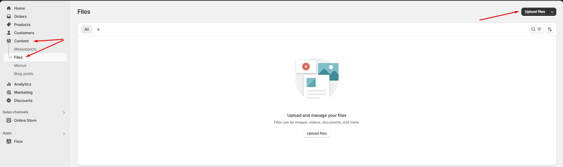 Step 1: From your Shopify admin, go to "Content" -> "Files" -> "Upload Files".