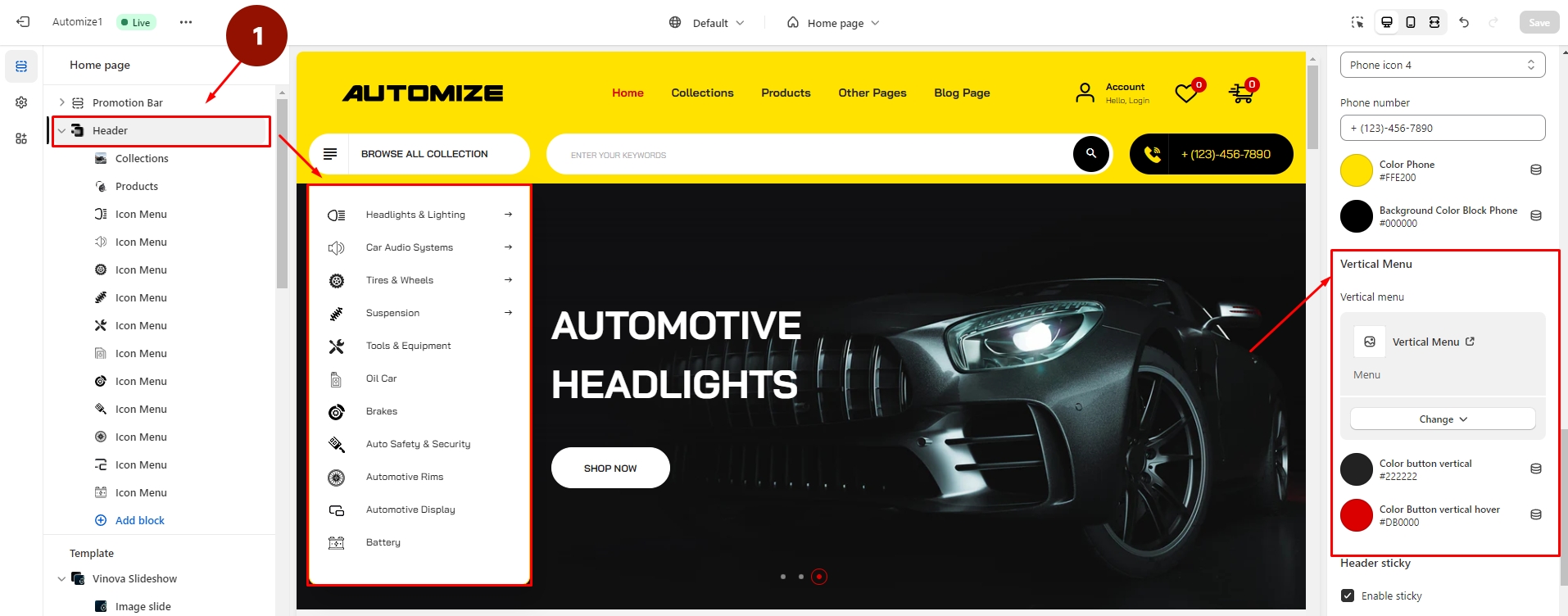 In the header customization panel, scroll down, and you will see the "Vertical menu" item; please check the "Show Vertical menu" item to display the Vertical menu. Or uncheck this option if you want to disable the Vertical menu. (photo #1)
