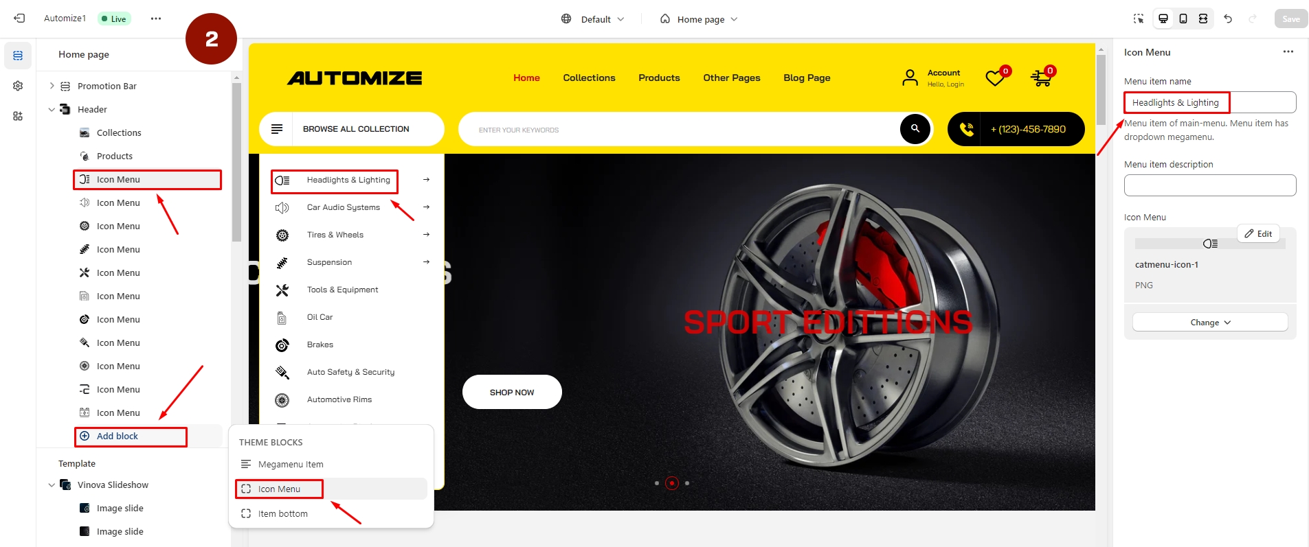 To configure the submenus, you need to add the "Vertical menu" block > name the item, attach a link to the item, and add an icon. As many menus as you want, add each block. (Please see photo #2)