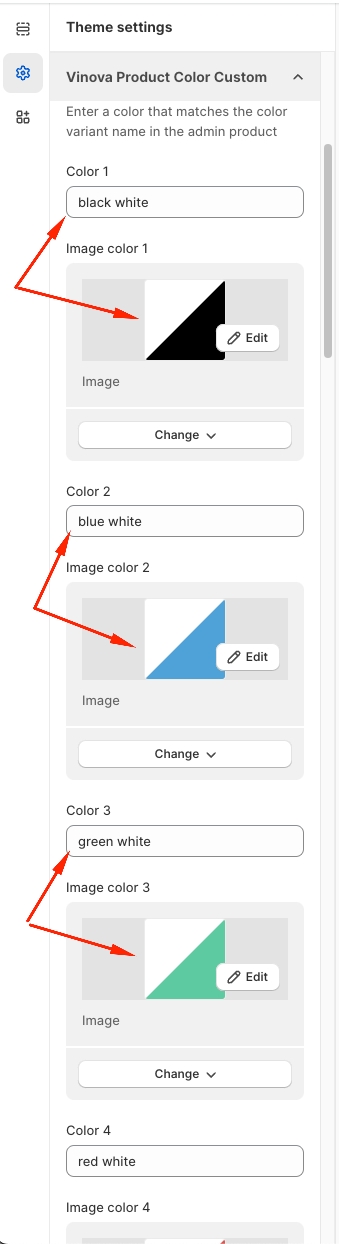 Create Variation: From "Theme Settings", click the tab "Vinova Product Color Custom", Upload each variation, and enter a name for it