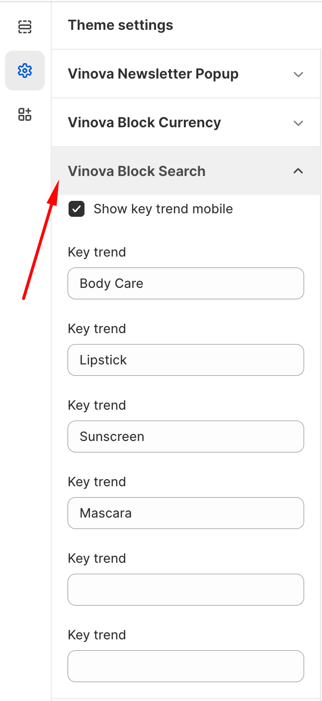 From "Theme Settings", click the tab "Vinova Block Search"