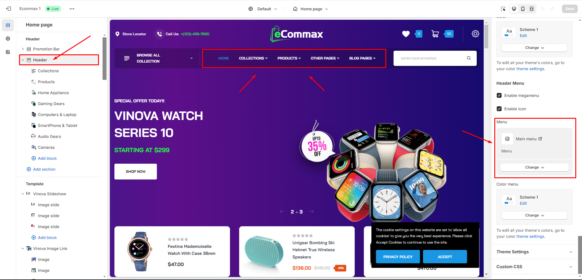 The Main menu is the menu on the Header. In this tutorial, we will show you how to set up the header menu and configure it like our demo. You can use this guide to set up your menu.