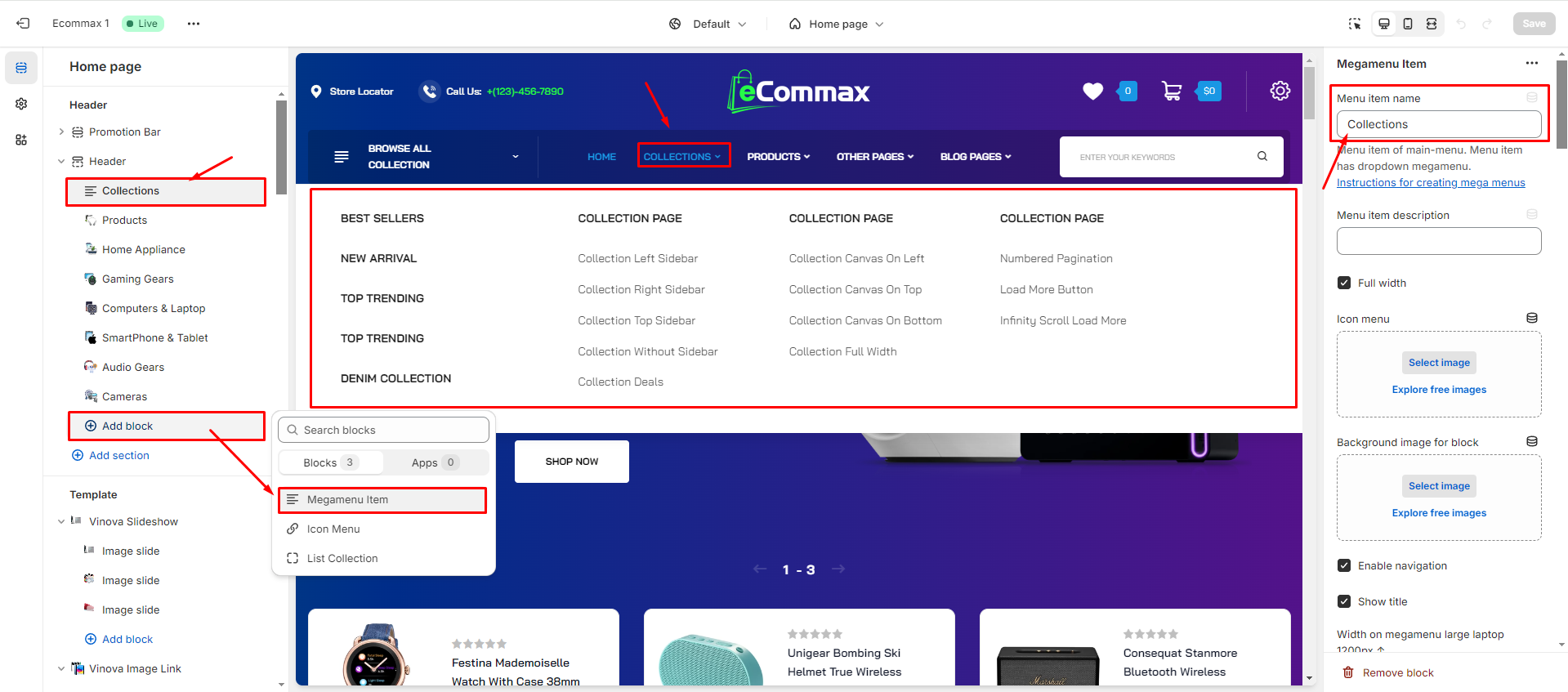 3. In the Megamenu Item block, there are items: menu, image, list collection, and product. You can customize it however you want.