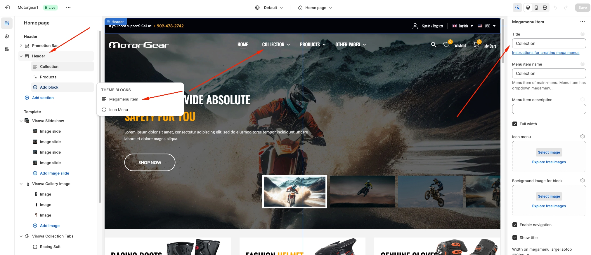 In the Mega menu block, there are items: menu, image, list collection, and product. You can customize it however you want.