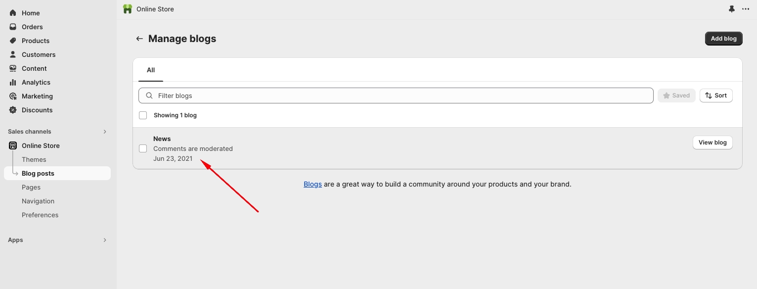• From your Shopify admin, go to "Online Store" -> "Blog Posts" -> Click the "Manage blogs" button.