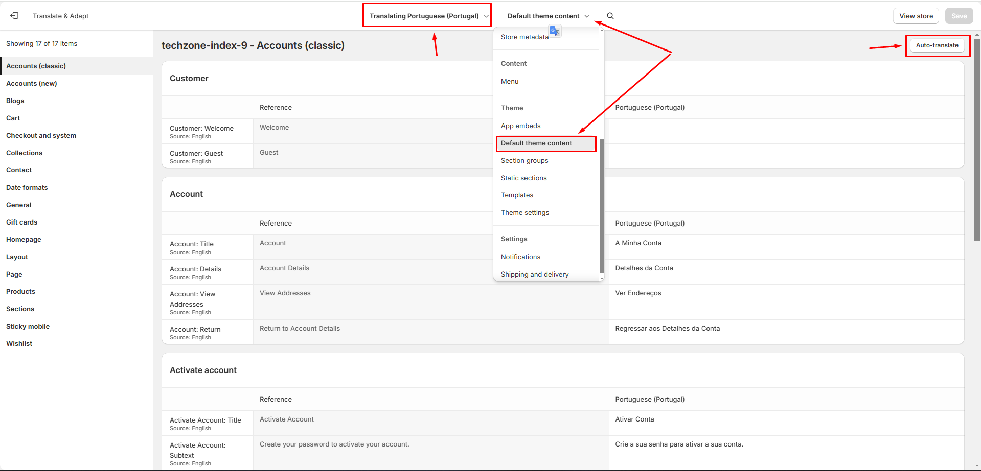 After installing the app, please click on "Apps" and select the "Translate & Adapt" application > select the language to be translated and select "Default theme content" > "Auto translate"