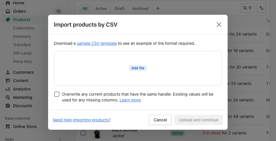 Importing products into your Shopify store using a comma-separated values (CSV) file is useful when you switch to Shopify from another platform or when you want to make many changes to your products or inventory. When you import products, the data is converted from the CSV file into products and you can select whether you want to publish your new products to all sales channels or only to your online store.